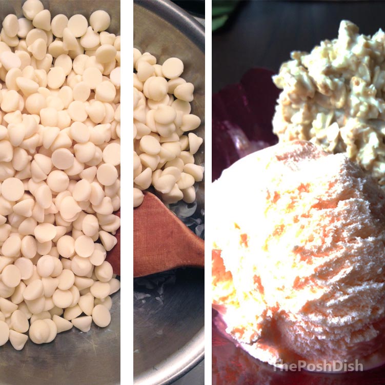 1. Melt the chocolate chips in a double boiler, or place a steel bowl on top of a pot of boiling water. For an easy way out pop them into the microwave, stirring occasionally. But to be completely honest, stove top is the way to go! The chocolate will retain its rich texture and won’t even come close to burning.