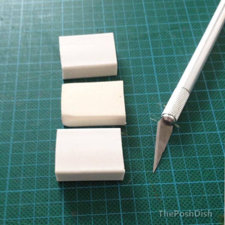 2. Depending on their size, cut your erasers in half (you want to end up with squares)